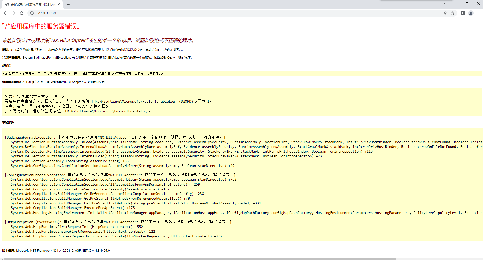 通过网页打开后如果报错:未能加载文件或程序集“NX.Bll.Adapter”或它的某一个依赖项。试图加载格式不正确的程序