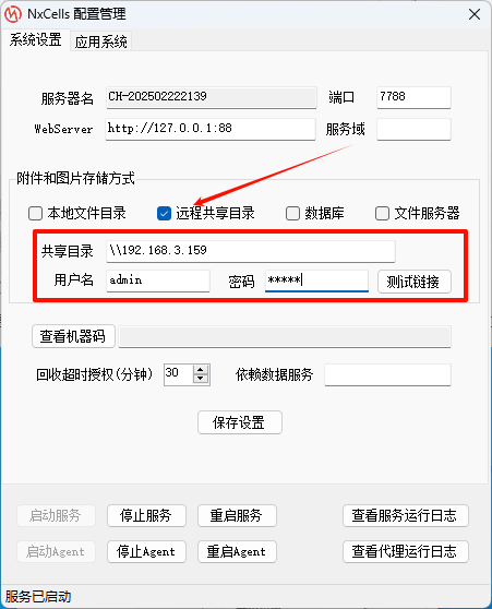 2,勾选远程共享目录,文件与附件即会存储到共享目录中。
