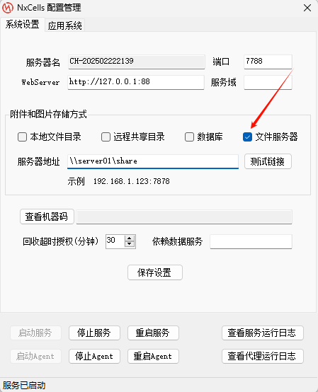 4,勾选文件服务器,文件与附件即会存储到指定的文件服务器上。