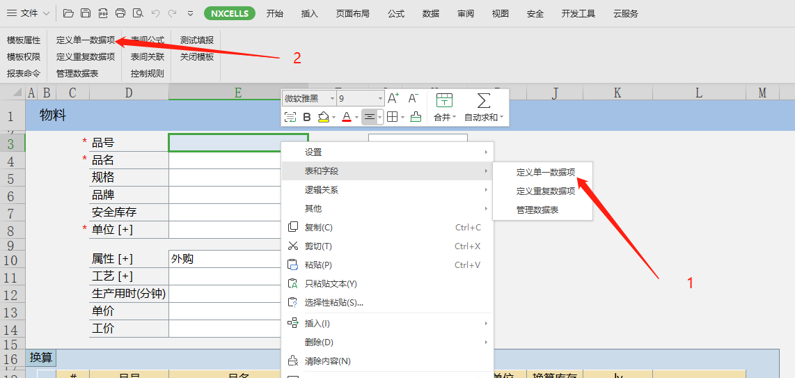 可以单个定义,也可以批量定义。单个定义是一个一个点击定义。例如先定义品号字段,选择品号字段后方的单元格,然后右击选择【表和字段】-【定义单一数据项】或者选择上方的【NxCells】目录下的【定义单一数据项】