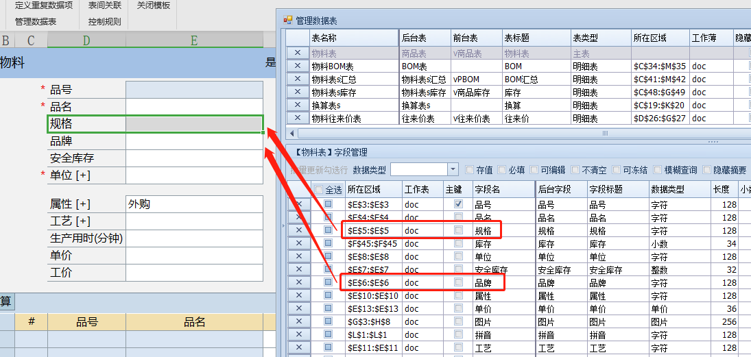 注意,在定义好的样式中,已经定义好的字段后续可能需要重新排版,不在管理数据表中删除字段重新定义的情况下,字段区域是可以重新拖动排版的。但是名称区域和数据项区域要一起拖动,并且要注意合并的单元格,以下方的图为例,要拖动【规格】与【品牌】,【规格】要拖$D$5:$E$5区域一起移动。【品牌】要拖$D$6:$E$6区域一起移动。