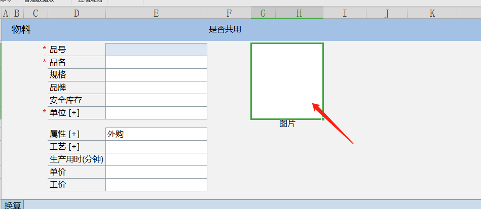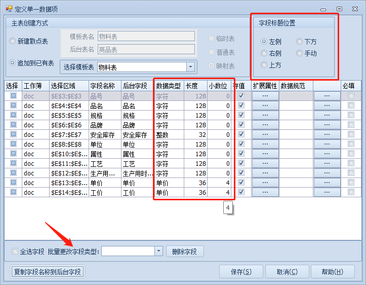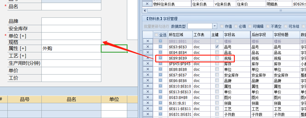 在《物料》模板上,我们定义已经确定好的单一数据项。