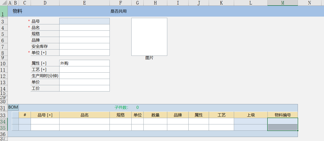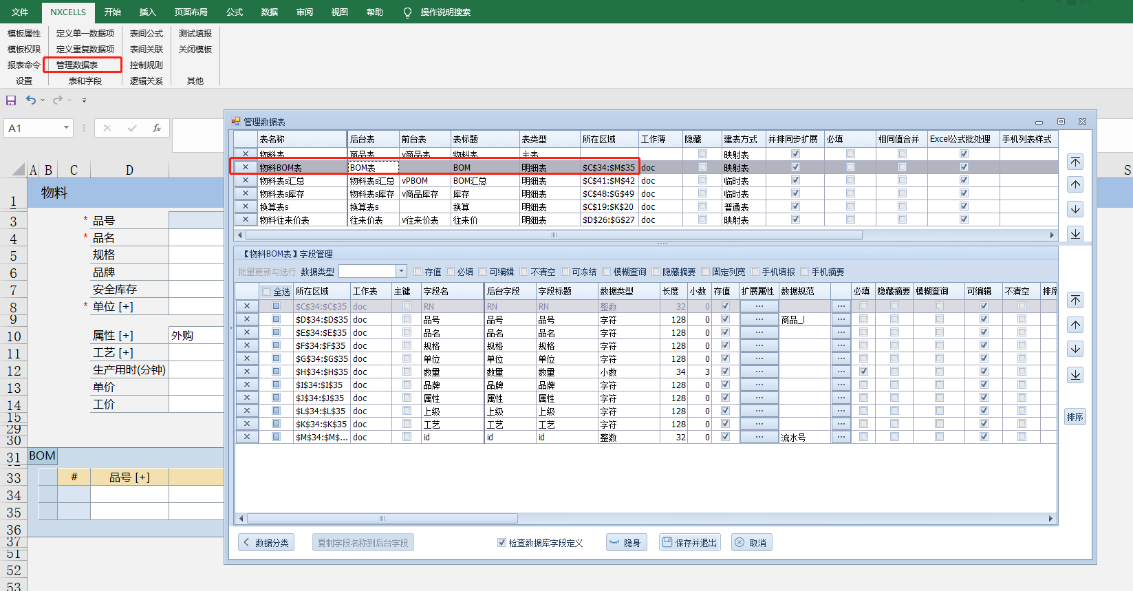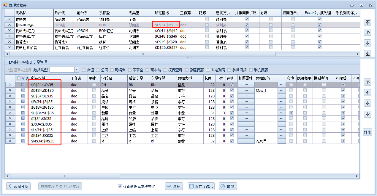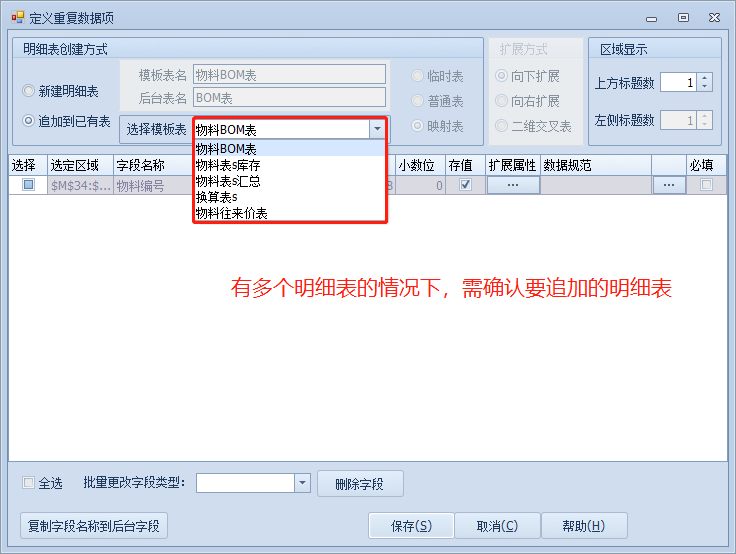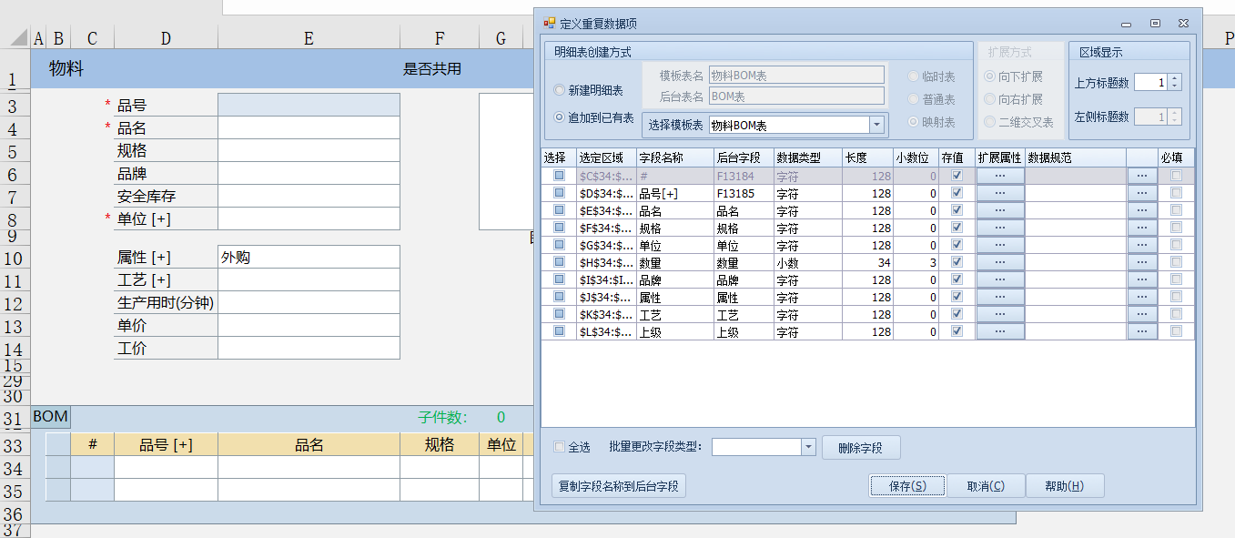 在设计的过程或者使用的过程中,会发现有些字段在之前定义中没有定义到,但是在使用过程中需要用到,那么我们就可以通过追加的形式把其追加到表中。例如,在上方的设计中,BOM表中没有物料编号,需要加上。实现方法如下: