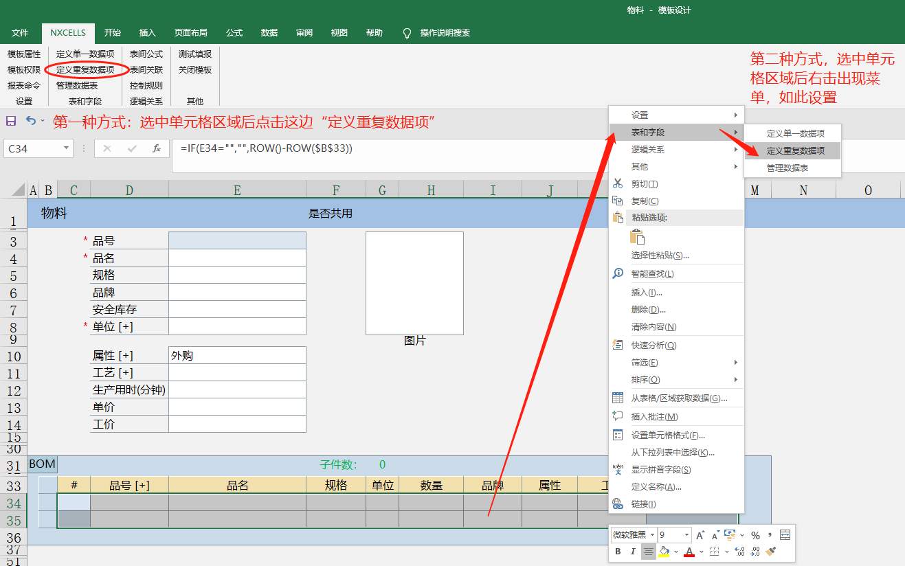 在《物料》模板的设计状态下,定义明细表区域,选中的区域必须连在一起,选择完毕后,点上方菜单栏【定义重复数据项】或右键快捷菜单里【定义重复数据项】,如下图: