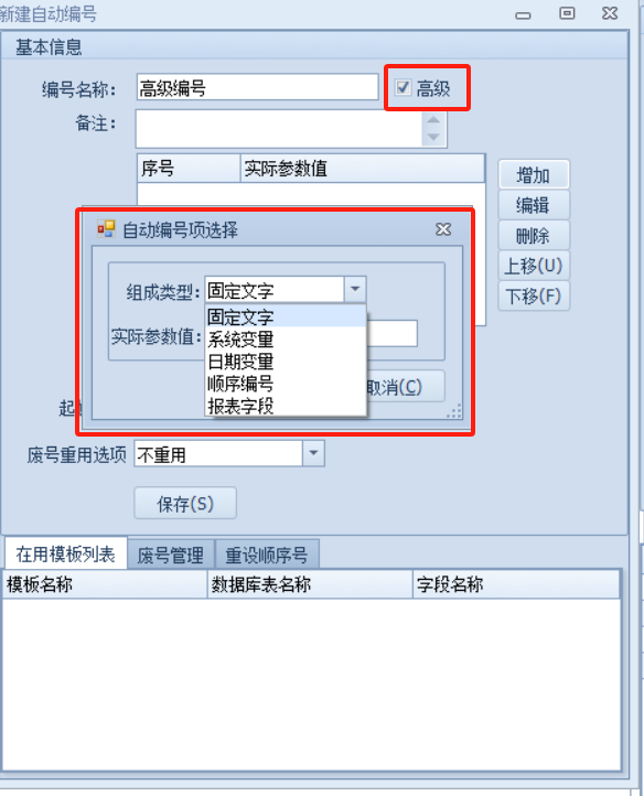 自动编号的高级设置即自定义编号内容组成,通过设定内容中的各个组成类型及对应参数自由搭建生成个性化自动编号