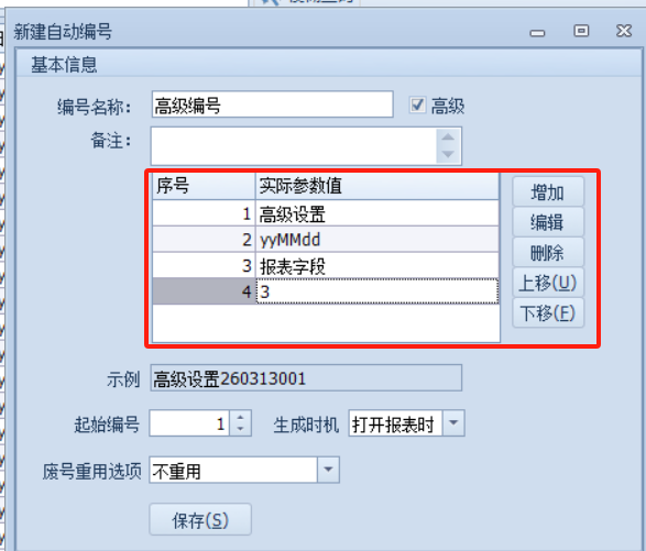 报表字段:使用时必须绑定使用模板中的字段,且编号生成时机为保存时生成