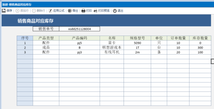 现有《销售订单》,该表记录销售订单中销售商品的明细;《商品档案》,该表存储了商品的详细信息及库存数量。做一个查询模板,样式如下。输入销售订单单号后能自动出来该销售订单的商品信息明细及其的商品对应的库存数量。