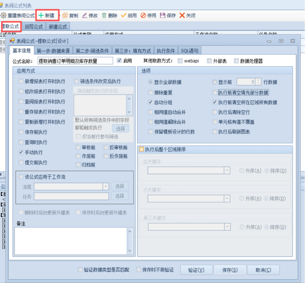 弹出表间公式列表界面,选择【提取公式】,然后点【新建】按钮,进入了”提取公式”界面,如下图: