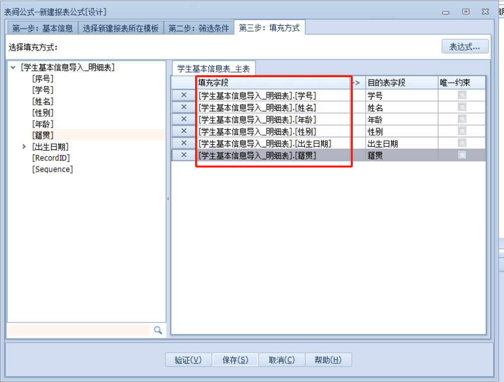 填充方式是把本报表里的字段填入到所选择的”新建表单所在模板”对应的字段里去,唯一约束根据字段【姓名】,唯一约束是防止数据录入重复,不论保存几次,若发现该姓名已存在,便不会在新建。如下图: