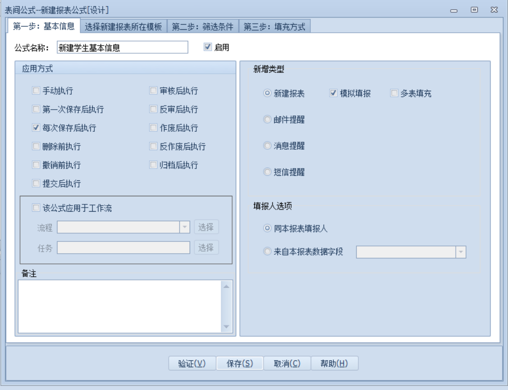 基础信息设置完成后,再选择要新建的模板《学生基本信息表》,下方的模拟填报相当于把新建的表单打开然后保存,会触发满足条件的表间公式,报表命令等,不勾选模拟填报则不会触发(例如报表A新建公式填报表B,若勾选模拟填报报表B中满足条件的公式和命令会在报表A保存时执行,若不勾选即使满足条件也不执行),多表填充,勾选后可以填充多个表单。如下图: