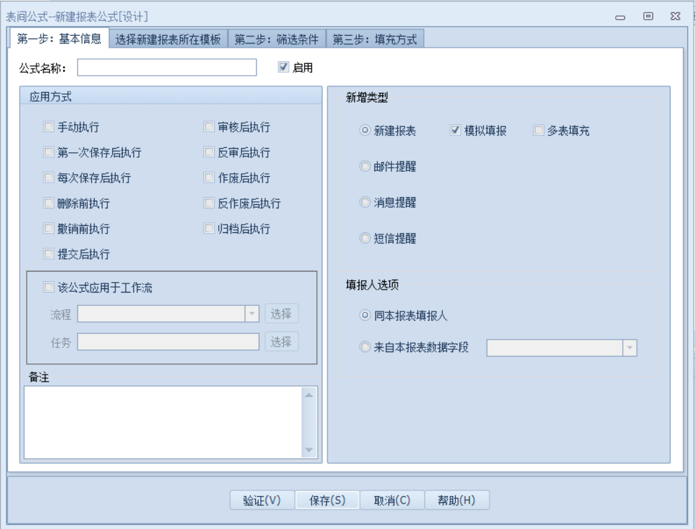 进入表间公式列表,选择【新建公式】,然后点【新建】按钮,进入了”新建公式”界面,如下图: