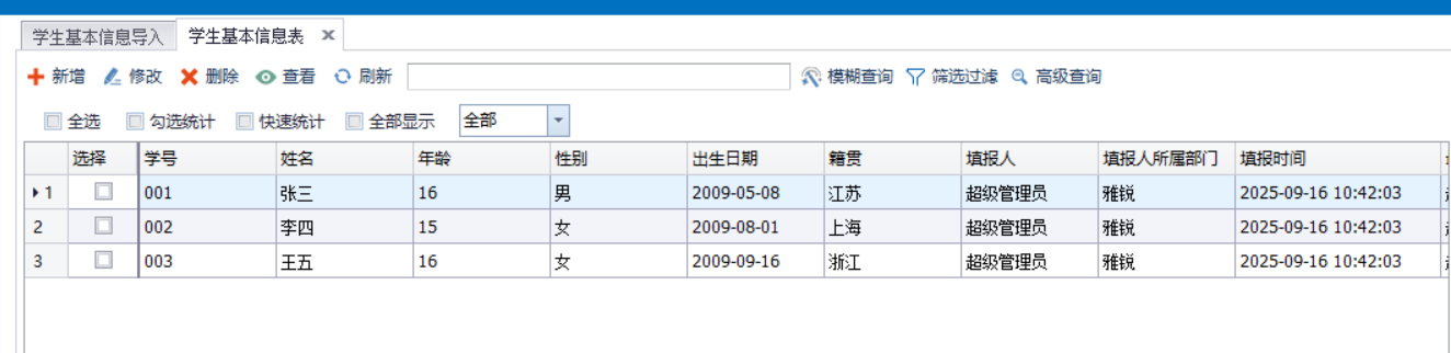在做《学生基本信息表》中,会发现一张一张的填报表单工作量大也麻烦,能不能通过一个导入表的形式,将数据通过复制粘贴等操作将数据填入到该导入表,然后导入表在保存的时候能够自动生成若干个学生的基本信息。