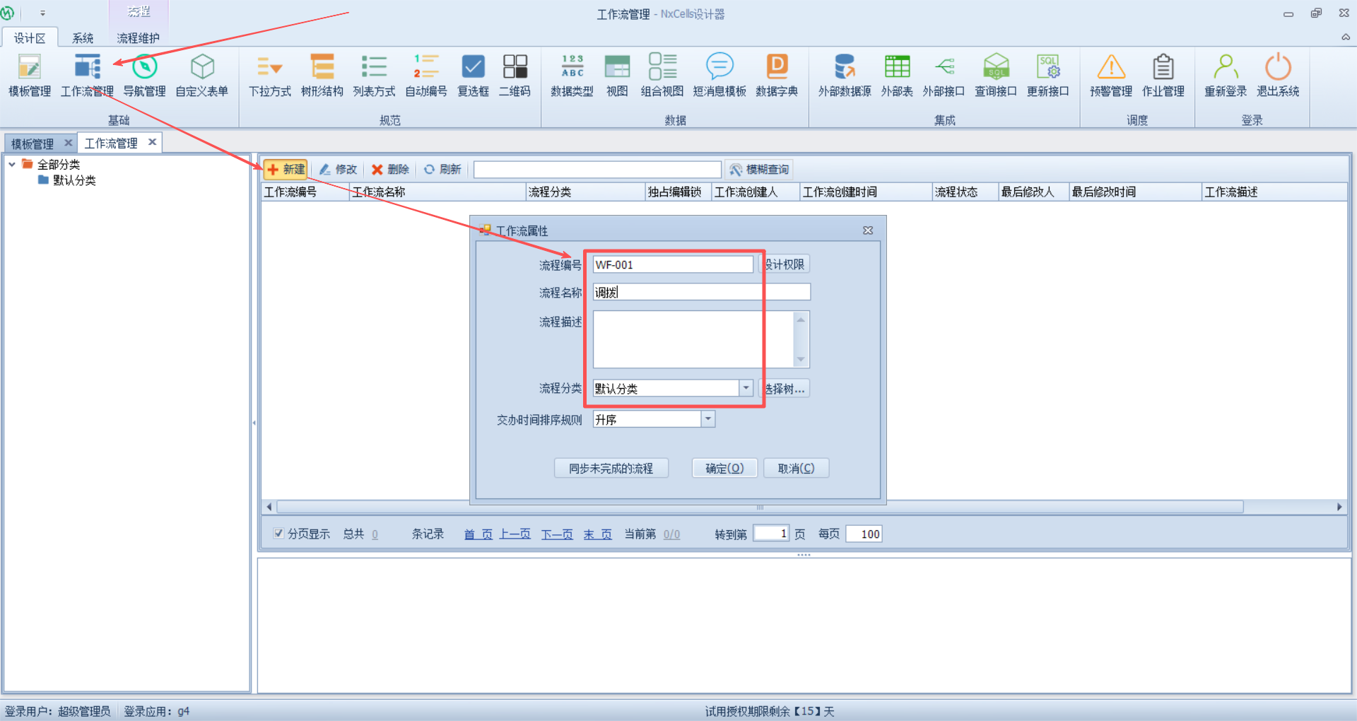 上一页 【设计区】—【工作流管理】—【新建】—点击【工作流属性】,如下图: 弹出窗口界面,如下: 【流程编号】输入”WF-001” 【流程名称】输入”调拨” 【流程分类】选择”审批流”(如果流程分类里没有需要的分类,直接分类里新增) 【交办时间排序规则】选择”升序”,输入完毕【确定】按钮返回。 下一页作者:魏仁友 创建时间:2021-11-04 14:03最后编辑:test 更新时间:2025-10-14 15:38
