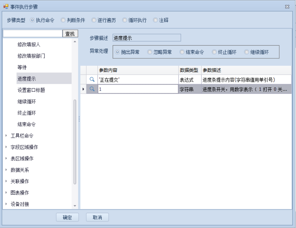 上一页 版本要求:Nxcells v 3.1.1-3+此基础命令在管理员触发按钮时会弹出一个进度条,进度条的内容可自定义。 报表命令进度提示执行的时候,如果后面的命令执行异常,就是自动关闭进度提示,命令结束。 下一页作者:wang 创建时间:2021-11-04 14:37最后编辑:test 更新时间:2025-10-14 15:38