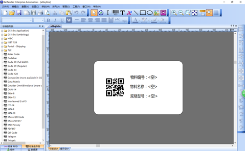首先使用Bartender软件设计一个标签命名为“wlbq.btw”,含有4个对象【物料编号二维码】、【物料编号】、【物料名称】、【规格型号】,