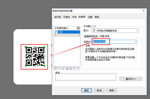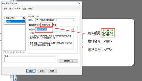 【物料编号二维码】的共享名输入“materialCode”