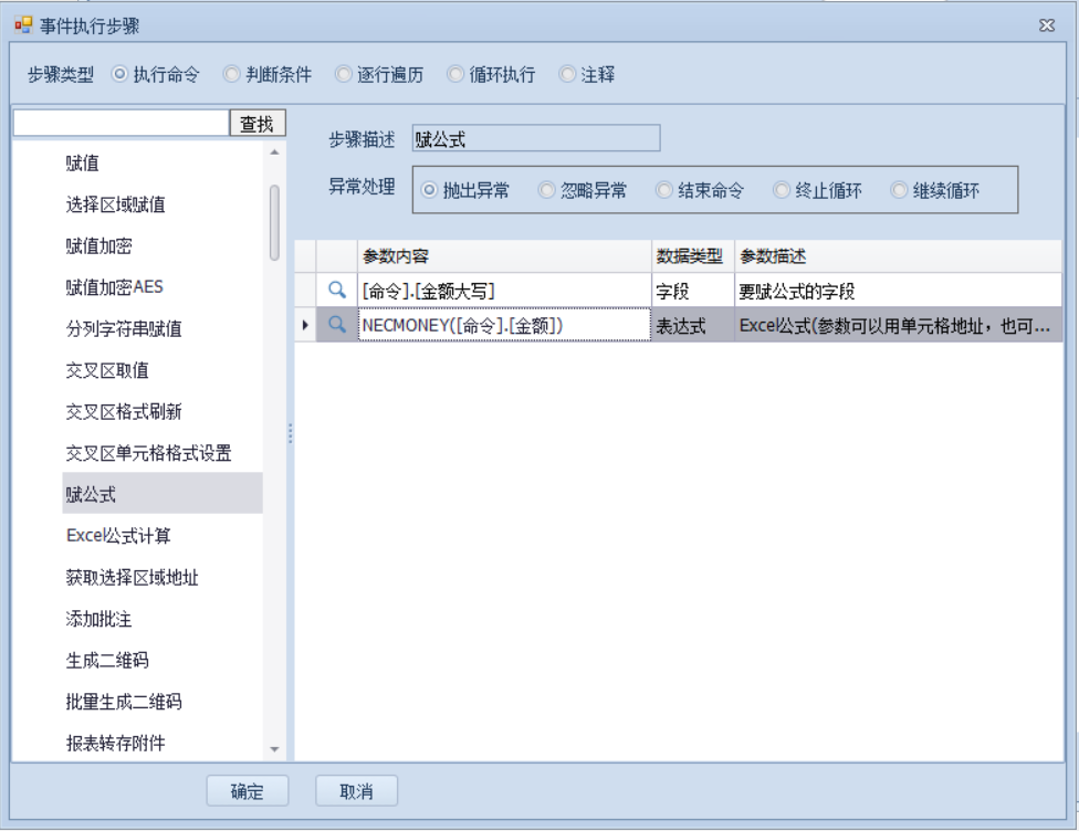 在填报表单的时候通过报表命令把某一个公式赋给特定的单元格,使公式在该单元格上运行。