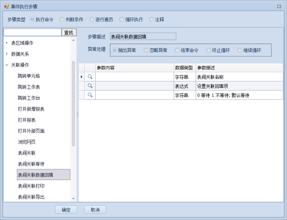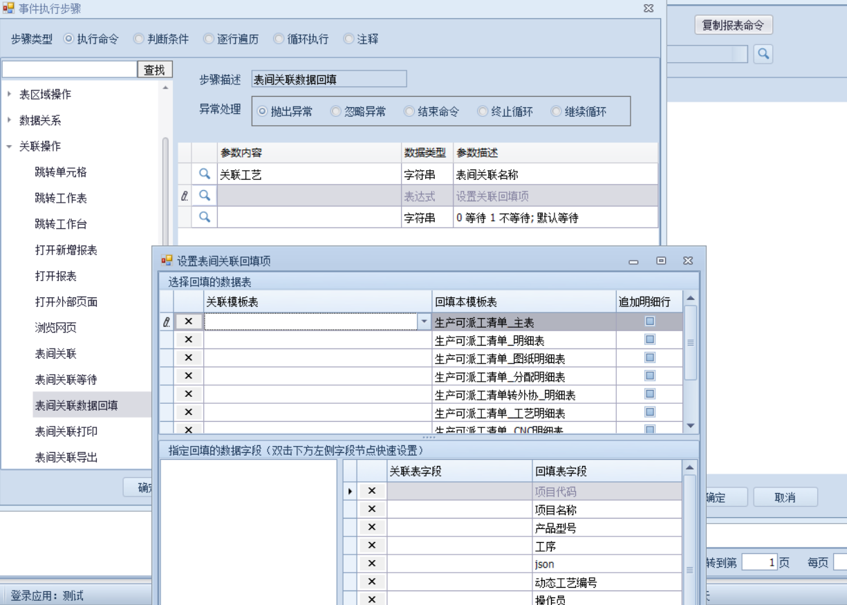 此命令在表间关联等待的基础上做出改进,打开关联报表之后待填报完毕,会将关联报表上的数据回填到当前表中。