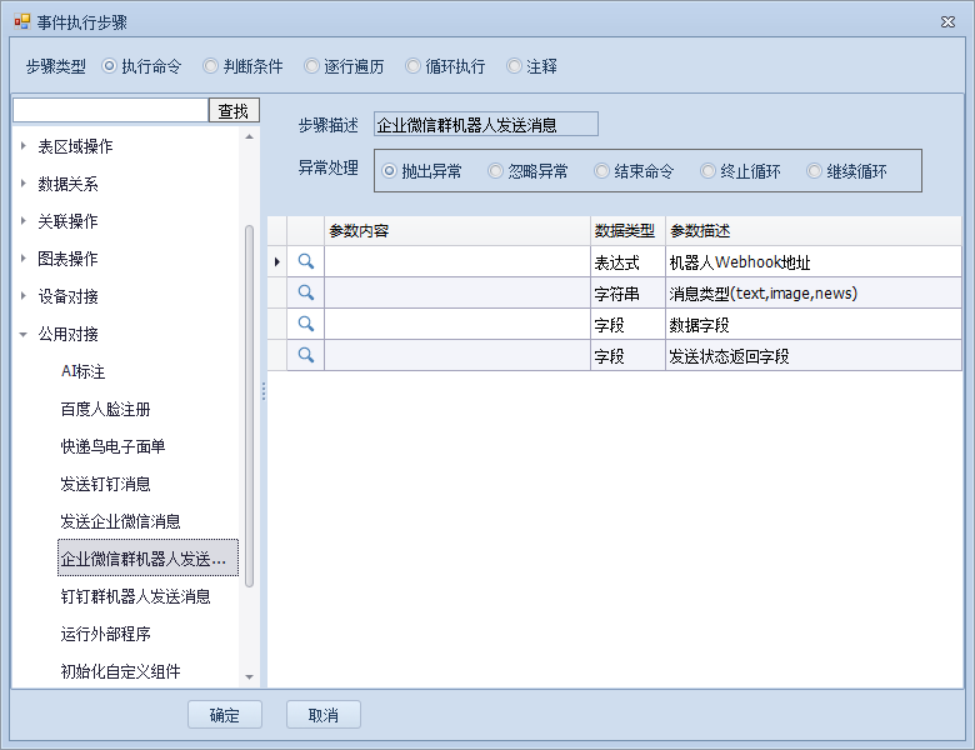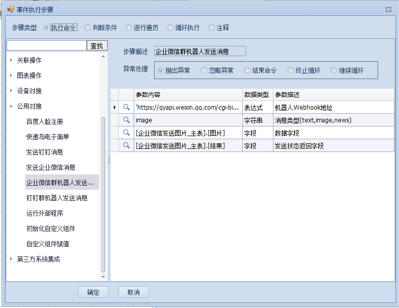 上一页 版本要求:3.5.5+ 具体设计可向真容官方沟通了解。 例如【机器人Webhook地址】需要在企业微信中建立,【消息类型】text为发送文本文件,image为发送图片;news暂不支持效果 下一页作者:wang 创建时间:2021-11-04 22:00最后编辑:test 更新时间:2025-11-03 11:23