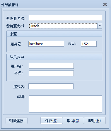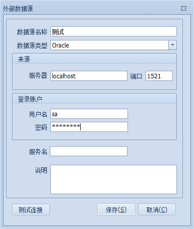 最后输入需连接的Oracle的服务名。点击”测试连接”,提示连接成功后,”保存”即可。