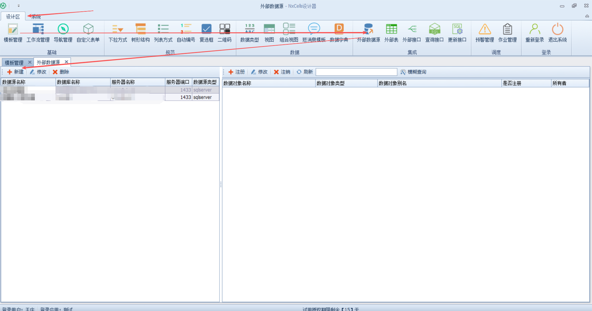【设计区】—【外部数据源】—【新建】,如下图: