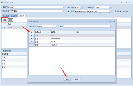 弹出窗口界面,接口类型选择【WEB_API】,根据接口文档填写接口地址,点击【保存】,接口通讯建立完毕后,就可以建立接口方法了,右侧点击【新建】,如下图: