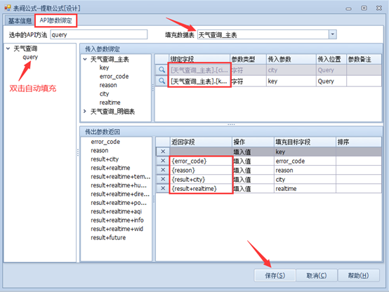 上一页 表间公式里调用表间公式-提取公式-基本信息界面,勾选【通过API提取】,其他设置如下图: 双击query填充API方法->选择要填充的数据表→填充【绑定字段】和【返回字段】,点击【保存】,一个表间公式就创建完毕了。 设置完毕,可点击【测试填报】,查看效果。 下一页作者:wang 创建时间:2021-11-04 22:32最后编辑:test 更新时间:2025-10-14 15:38