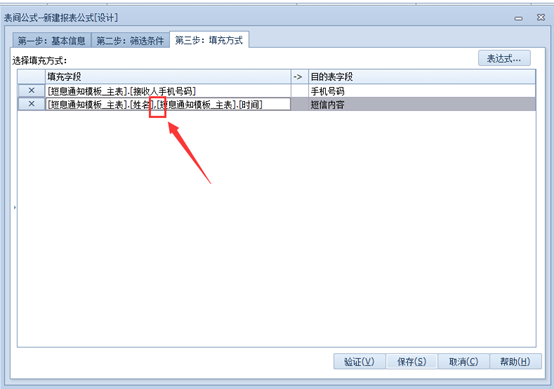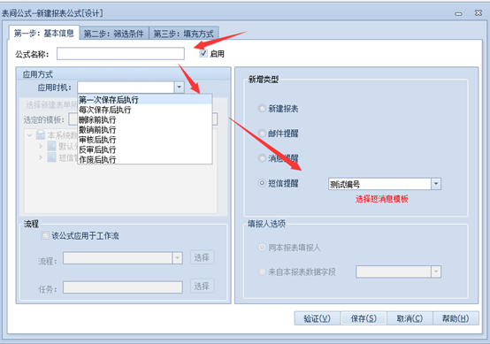 上一页 进入模板的表间公式,而后选择【新建公式】,在弹出界面输入【公式名称】,选择【应用时机】,在新增类型处选择【短信提醒】,选择需要绑定的短消息模板。 完善筛选条件。 绑定传递字段(注意,当短消息模板设定为多个参数时,各参数之间需要用逗号隔开,如下图所示)。 设定完成后,保存即可。 下一页作者:wang 创建时间:2021-11-05 08:59最后编辑:test 更新时间:2025-10-14 15:38
