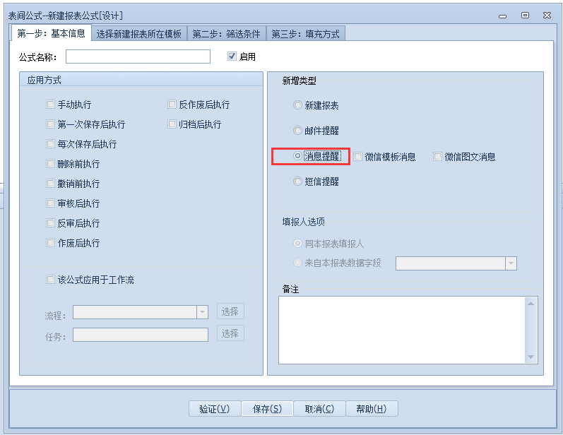 上一页 新建公式建立推送: 钉钉消息和企业微信一样,勾选【消息提醒】即可发送text消息或者图文消息,勾选【微信模板消息】需要购买消息模板,【微信图文消息】被【消息提醒】替代(如要在钉钉上关联打开报表,请用普通消息并且该模板需发布手机端方可)。 下一页作者:wang 创建时间:2021-11-05 09:22最后编辑:test 更新时间:2025-10-14 15:38