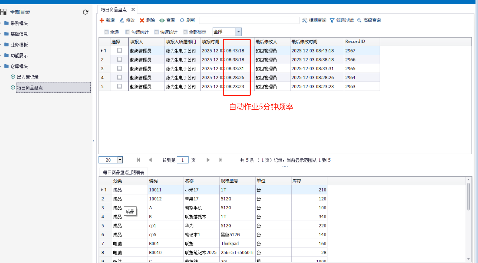 - 场景-前台表和自定义报表标识组合展示出入库情况