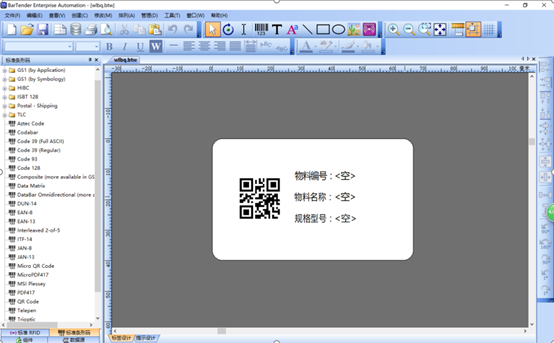 1、安装好bartender软件后,打开,设计一个标签模板,例如命名为:“wlbq.btw”,含有4个对象【物料编号二维码】、【物料编号】、【物料名称】、【规格型号】,如下图: