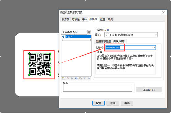 2、为每个传值对象设置一个共享名,此处设置是为了Nx调用Bartender命令时为其传值,【物料编号二维码】的共享名输入“materialCode”,【物料编号】的共享名输“materialCode”,