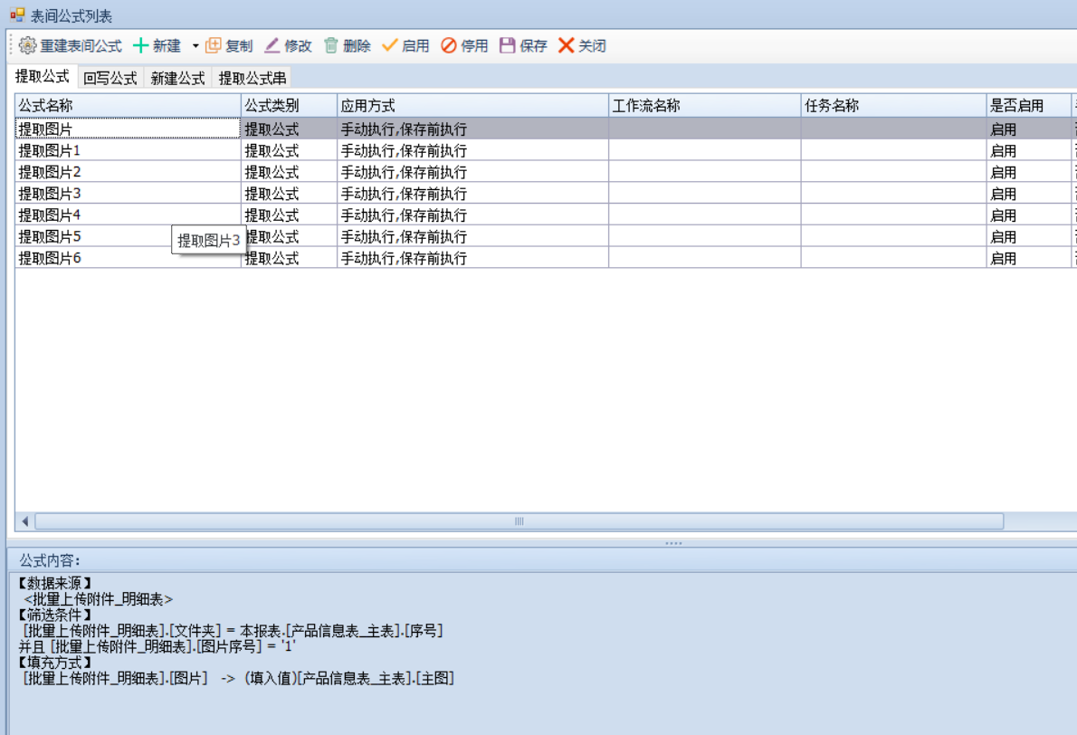 图片已经导入到我们系统,下一步在产品信息表写提取公式进行提取即可,需要将图片提取到7个图片主表,所以写7条提取公式保存前执行,之前的图片序号就跟对应主表一一对应写提取公式,之后停用其余公式,批量报表重存即可