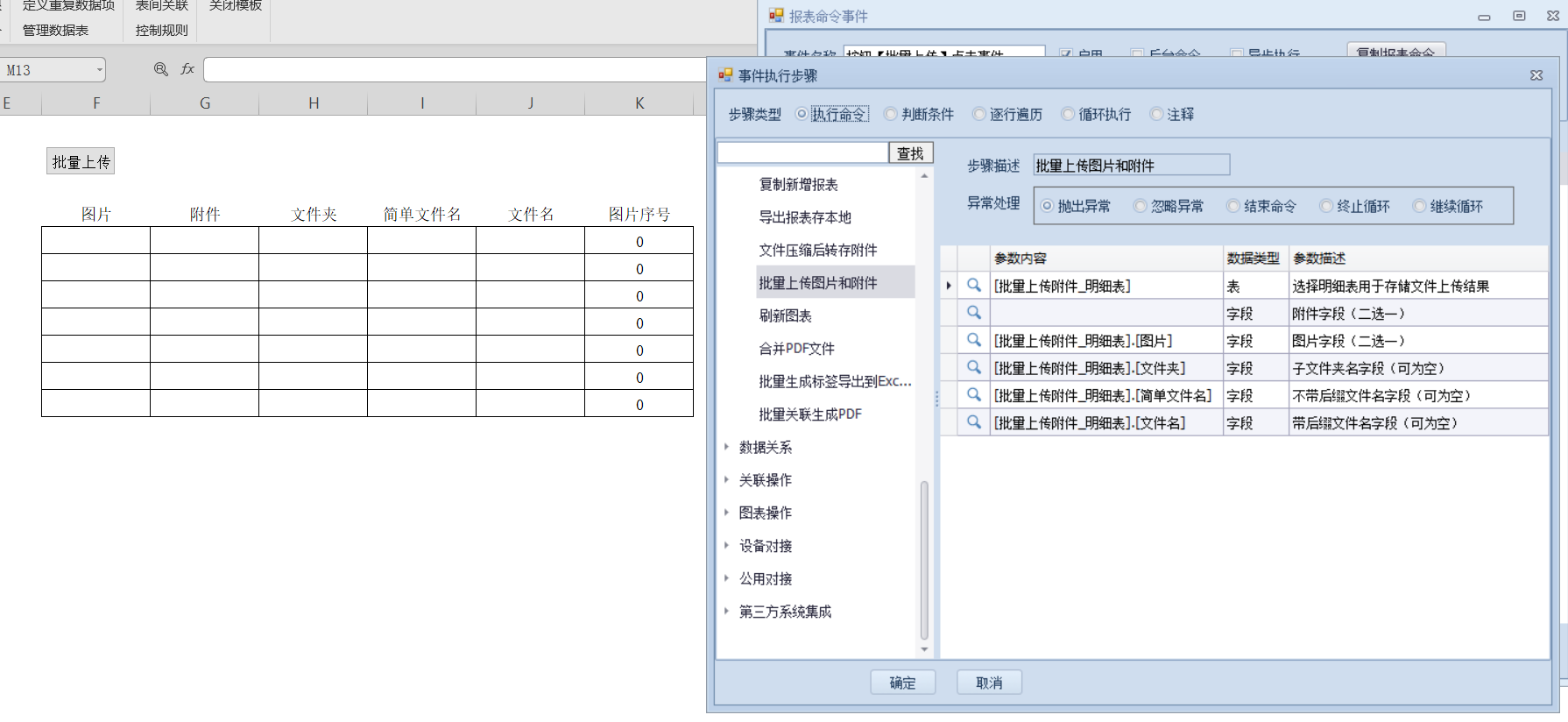每组图片有1-7张不等的图片,现在需要做一个批量上传存储图片的模板,用于将所有的图片都上传上来,建立如图所示的明细表,使用批量上传图片和附件报表命令,绑定按钮方便使用