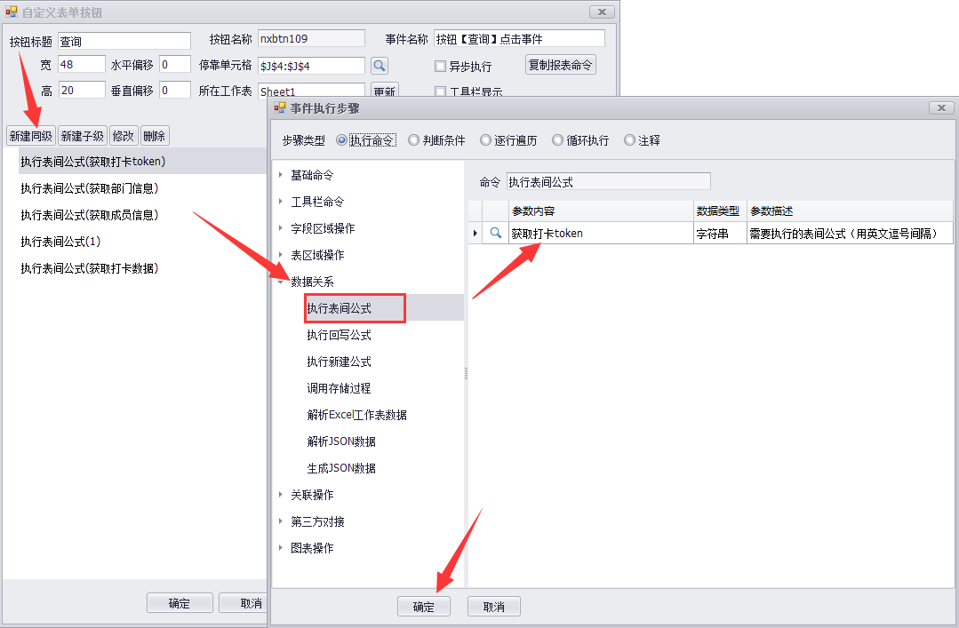 点击【新建同级】-【数据关系】-【执行表间公式】,选择创建好的表间公式,点击【确定】