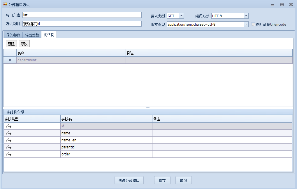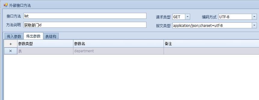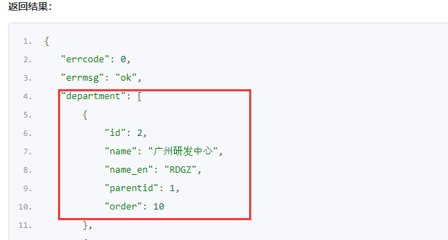 从文档中给出的返回结果中可以判断出,department返回的是一个明细表,所以在表结构中要创建一个表名为department的明细表,明细表字段如下图: