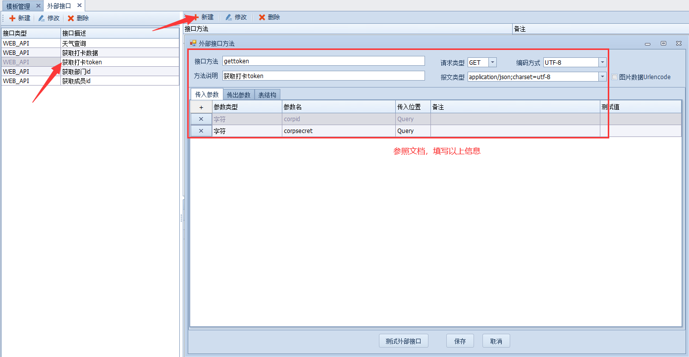 选中建立好的接口通讯,点击【新建】,接口方法、请求类型以及传入、传出参数、表结构在文档中都已明确给到。
