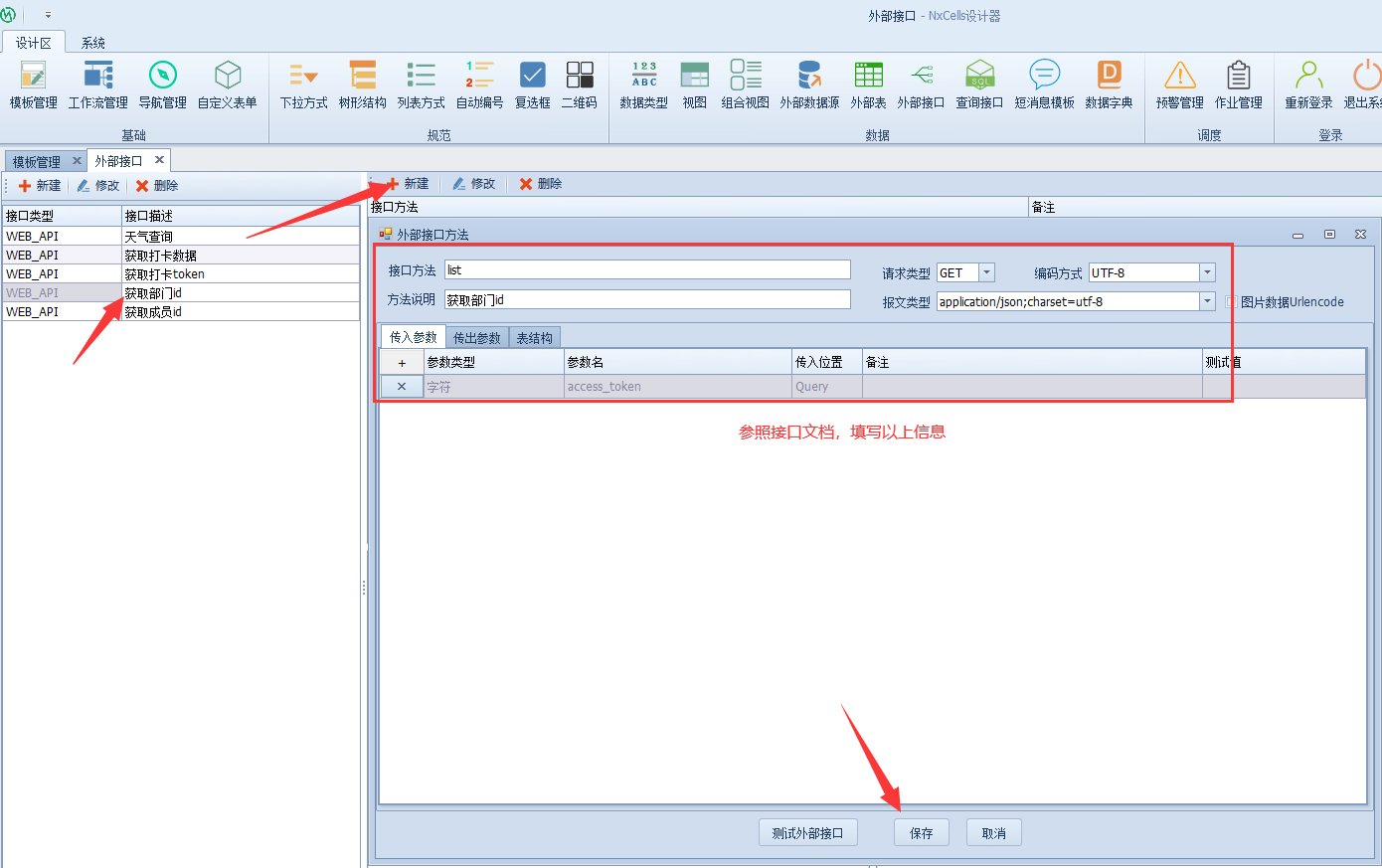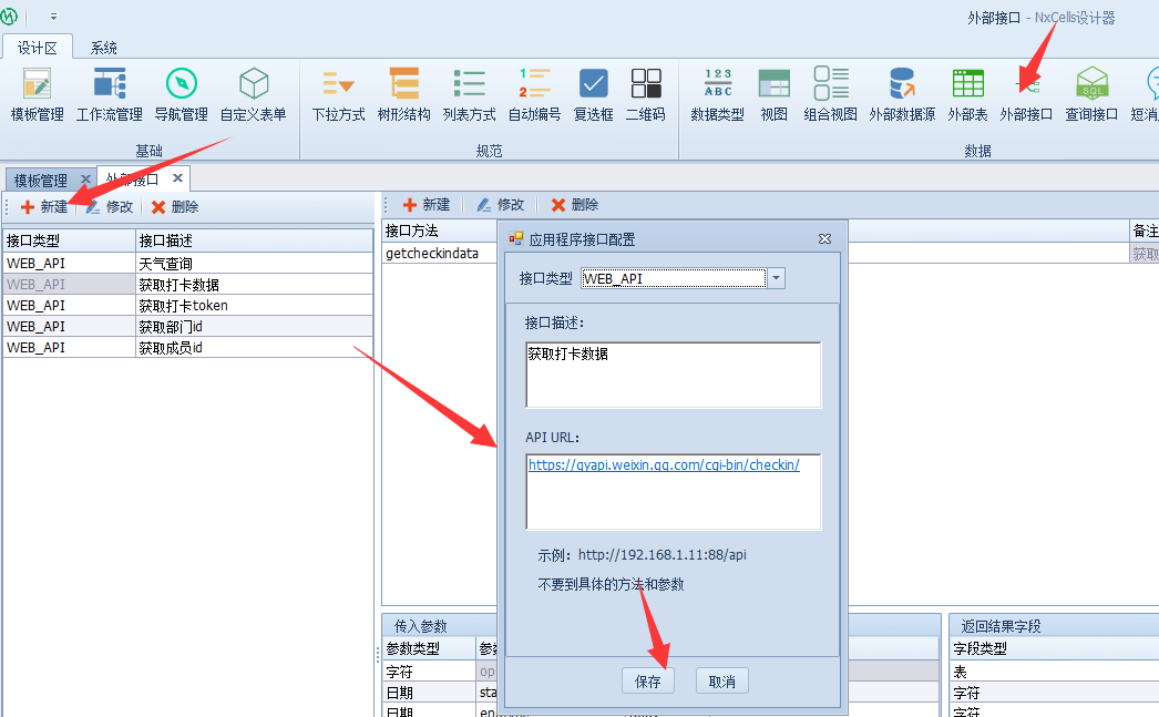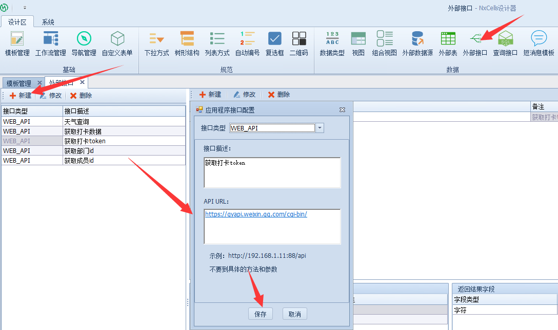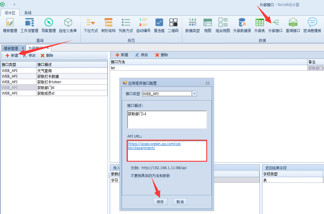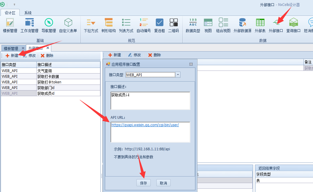 打开Nxcells设计端,选择【外部接口】-【新建】,填写接口描述和API URL,点击【保存】,通讯建立完毕。