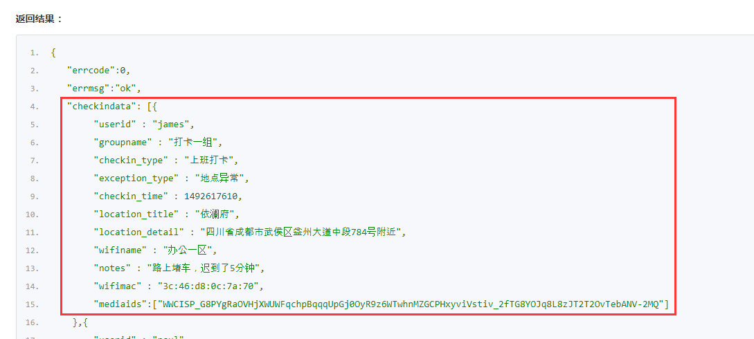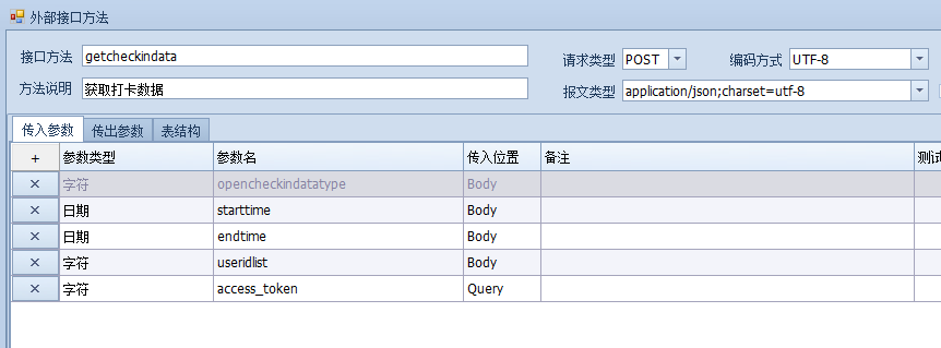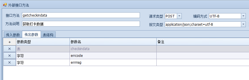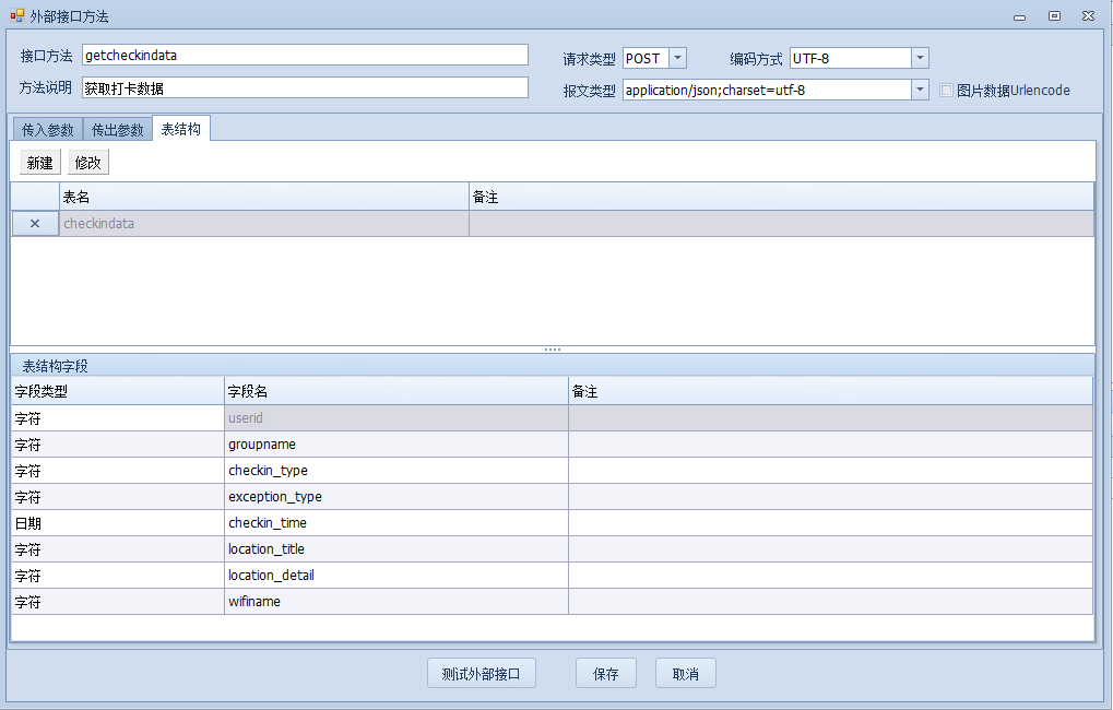 根据文档中给出的返回结果,可以判断checkindata为明细表,所以,在表结构中要创建一个名为checkindata的明细表,明细表字段如下: