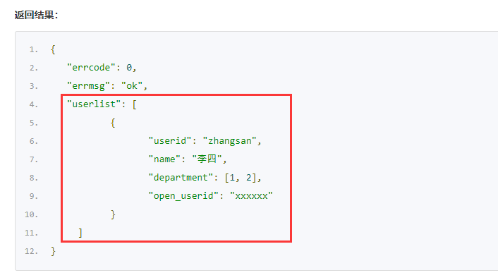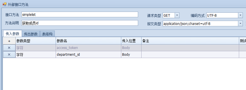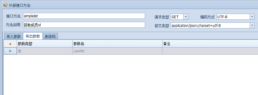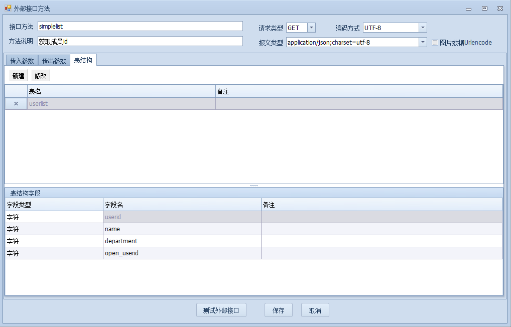 通讯建立之后,创建接口方法,根据文档中给出的返回结果,判断userlist返回的同样是明细表,所以在表结构中,创建一个名为userlist的明细表,明细表字段如下: