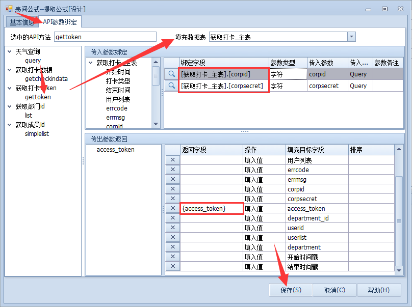 选择【API参数绑定】-双击方法名-选择要填充的数据表-绑定传入、传出参数,点击【保存】