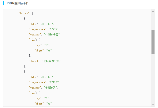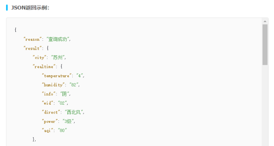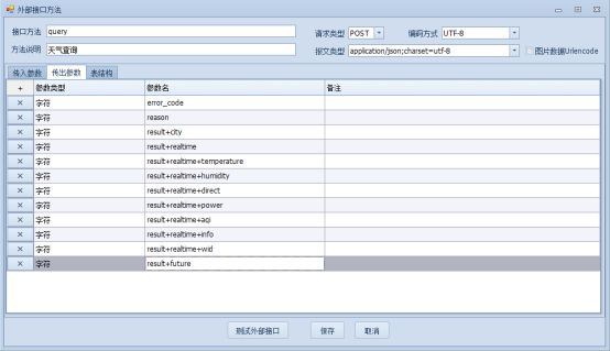 根据接口文档中JSON返回示例可以看出,result参数和city、realtime、future属于嵌套关系,因此在传出参数这里,以【+】体现这一嵌套关系。