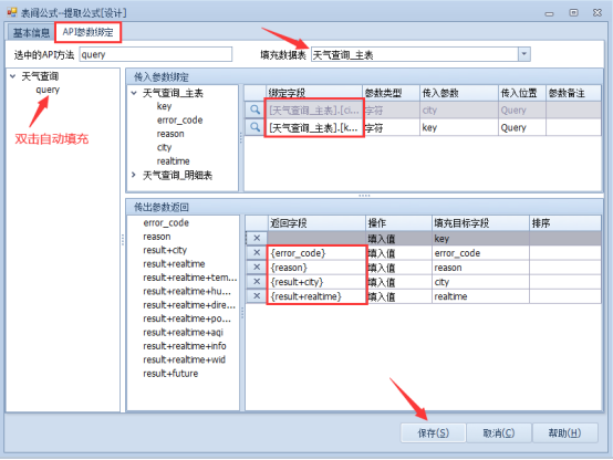 选择【API参数绑定】->双击query填充API方法->选择要填充的数据表->填充【绑定字段】和【返回字段】,点击【保存】,一个表间公式就创建完毕了
