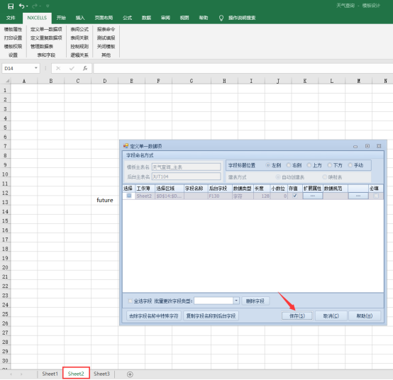 下面是提取future明细表里的字段内容,这里我们可以通过插入一个报表按钮,首先先在sheet2中定义一个辅助字段,如下图: