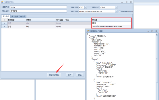 接口方法建立完毕之后,我们可以通过【测试外部接口】按钮,来检验建立的接口方法是否可行,【传入参数】-填写【测试值】,点击【测试外部接口】即可。