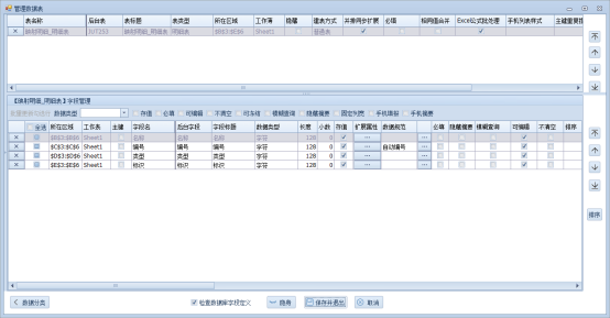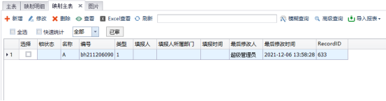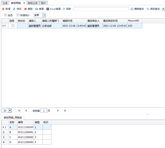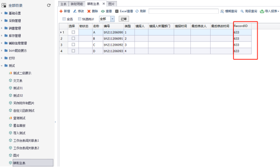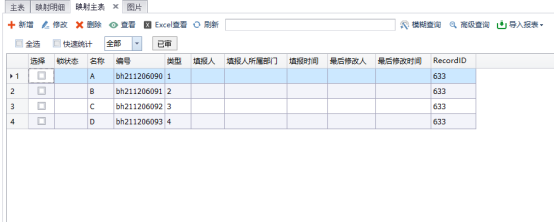 例如:如下想制作一个A表(主表)映射到B表(明细表),通过在B表填写报表数据,可以在A表上面逐条显示查看填报信息,但因为明细表填入所有数据只有一张报表,也就只有一个recordid,反馈到主表是单独的报表数据,但是都是来自同一个recordid报表的明细表,无法同时存在,因为数据库里报表id必须唯一,这时就需要用到自定义报表标识,用只有唯一数据的字段来代替。如下: