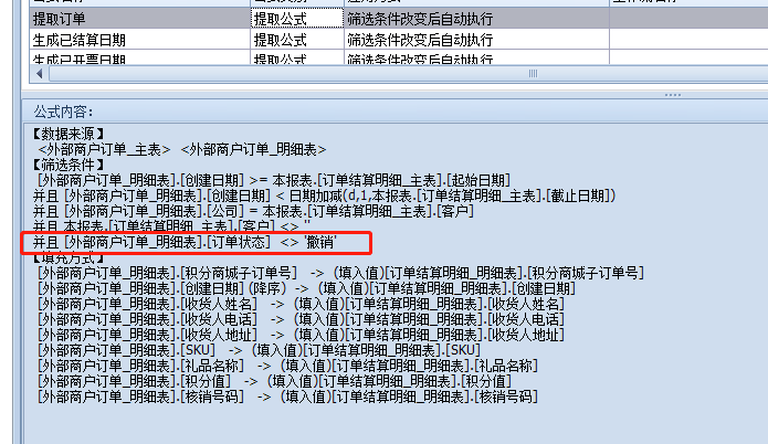 上一页 问题描述:“外部商户订单”这个表单中会出现订单撤销的情况,遇到撤销的订单,希望有一个标注订单状态的功能,并且在“订单结算明细”中不显示该撤销的订单 解决方案:做一个下拉方式,值为撤销,当有订单撤销时,选择撤销在“订单结算明细”提取订单的公式中,加上订单状态<>’撤销’的条件,撤销的订单就不会进入结算 下一页作者:admin 创建时间:2021-12-07 09:55最后编辑:test 更新时间:2025-10-14 15:38