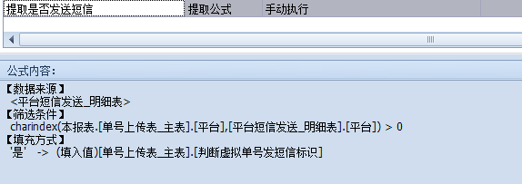 执行短信发送的模板都有一个字段作为标识来判断是否发送短信,在模板中做提取公式,利用charindex函数来判断当前的平台是否在平台短信发送表中,当值大于0的时候就返回一个标识到短信发送标识字段,这样就可以由使用者控制发送短信与否