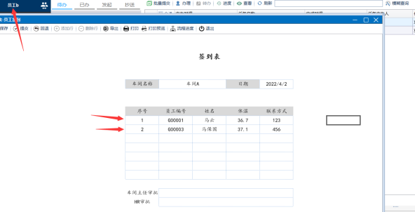 员工b进行任务待办,起初他的签到单上显示员工a填写的信息,然后进行填写自己的信息(。