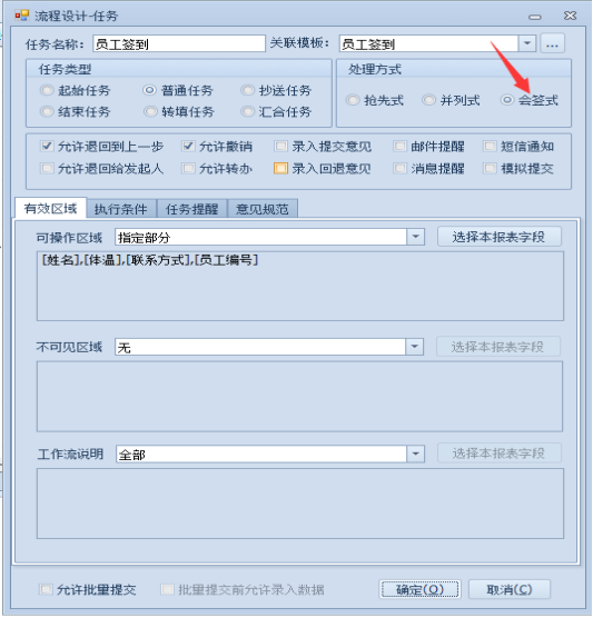 会签式:如果希望能让多人执行本任务,当多人都处理完本任务时才转到下一任务执行人那里,且下一任务执行人只能收到一个任务,这时就要设计会签式。